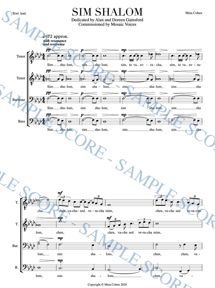 Sim Shalom was premiered by Mosaic Voices (cond. Michael Etherton) at the New West End Synagogue, London (16th February 2020). It was the first work by a non-male composer ever to be performed in an Orthodox Synagogue in the UK, as reported by UK media outlets.